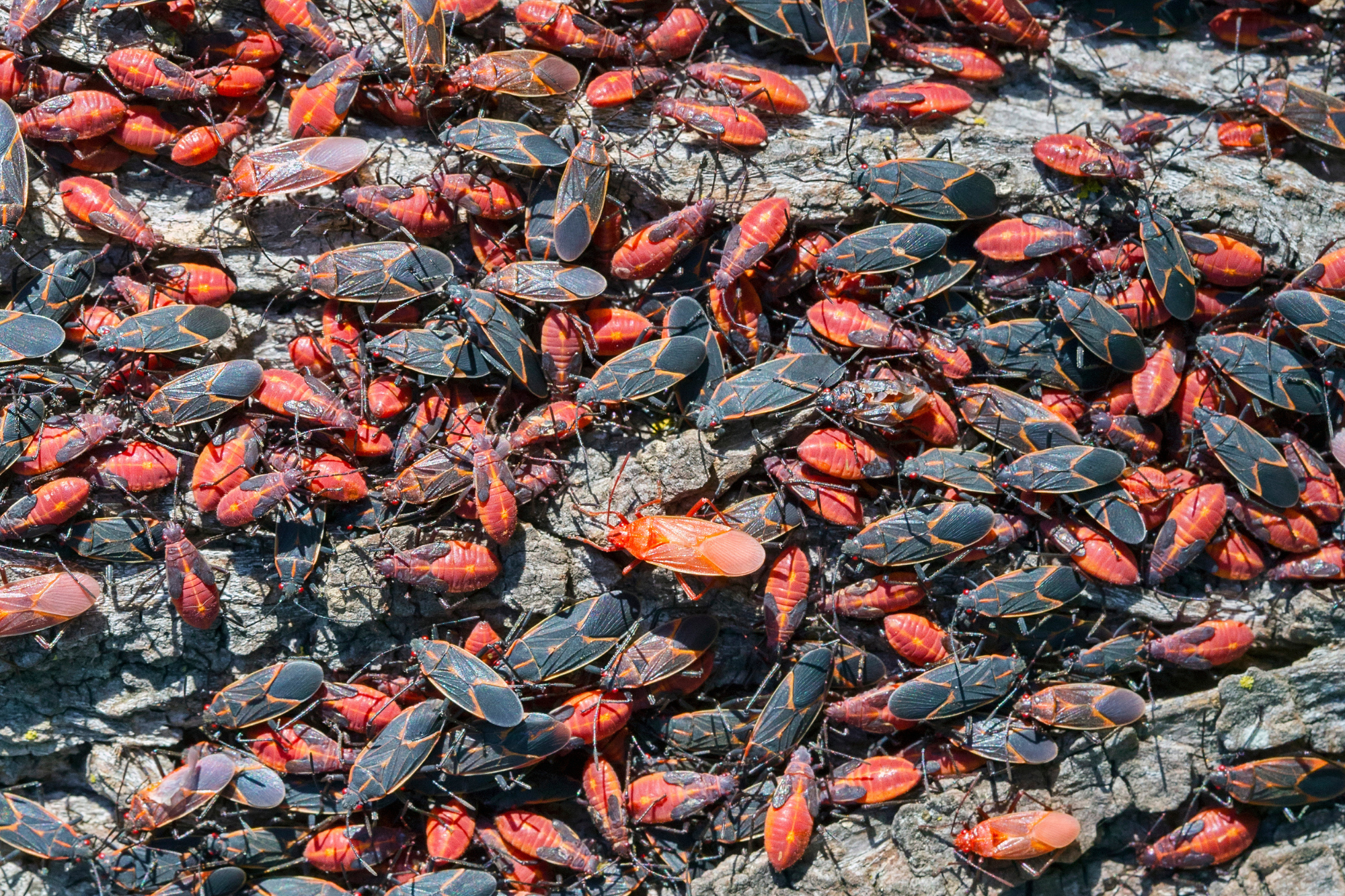 Boxelder bugs are commonly found on or around Boxelder trees, which is where they get their name. These bugs can also be found around maple or ash trees during the spring, summer and fall months. Boxelder bugs will congregate in large groups on the south side of buildings, roofs, trees or rocks to be there when the sun hits. At the end of fall, boxelder bugs will begin their group migration into nearby buildings and homes to overwinter in.